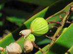 花から種子へ無事受粉が済んだ花は花びらが枯れるとその付け根が膨らんできます。右の写真では枯れた花びらの付け根が淡い緑色になってふくらんでいます。この中には種子が詰まっています。この段階では熟しておらず、緑色の果皮を剥がすと白い種子が出てきます。 |